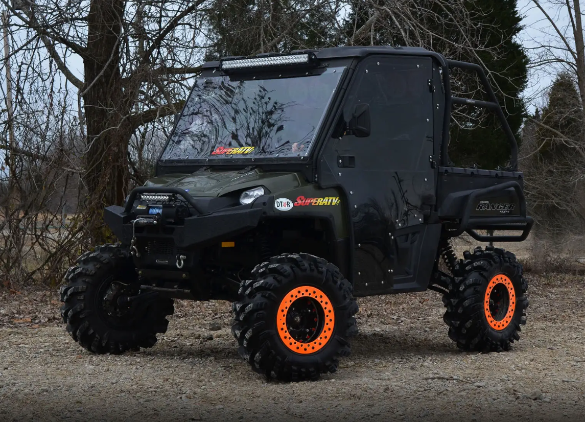 Enjoy your Polaris Ranger year-round with SuperATV's Polaris Ranger Cab Enclosure Doors, designed to keep out rain, snow, mud, dust, rocks, and debris. These full-size, hard doors provide robust protection for your cab, allowing you to tackle any weather condition or terrain without worry. Crafted from durable polycarbonate with a UV-resistant, powder-coated steel frame, these doors are built to withstand the elements while adding functionality and style to your Ranger.