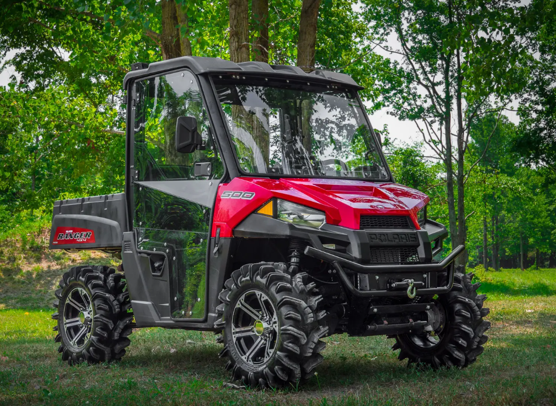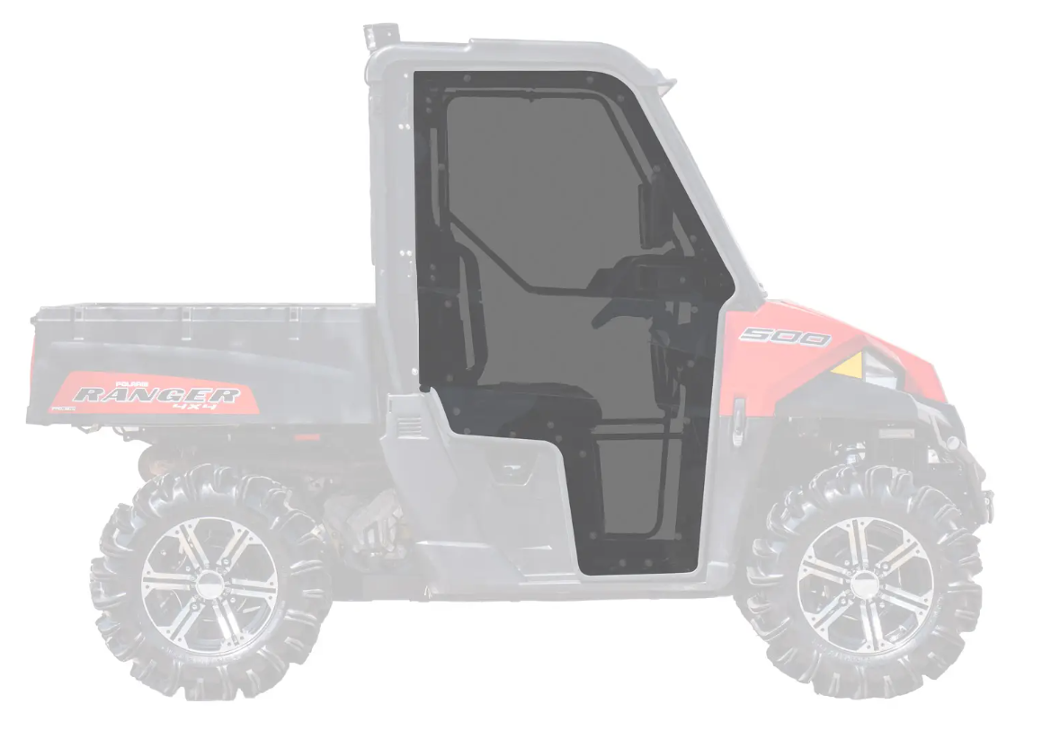 Enhance your Polaris Ranger Midsize with SuperATV’s Full Doors to elevate every ride's comfort and protection. These doors are crafted from your choice of scratch-resistant or non-scratch-resistant lightly tinted 1/4” hard-coated, abrasion-resistant polycarbonate. This material ensures durability against the toughest trails without easily scratching. Each door is reinforced with a heavy-duty carbon steel frame for rigidity and strength, complemented by a wrinkle black UV-resistant powder coat finish for added durability and style. Featuring a rubber seal, these doors guarantee a rattle-free ride. Complete your cab with front and rear windshields and a roof secured by a lockable door latch.
