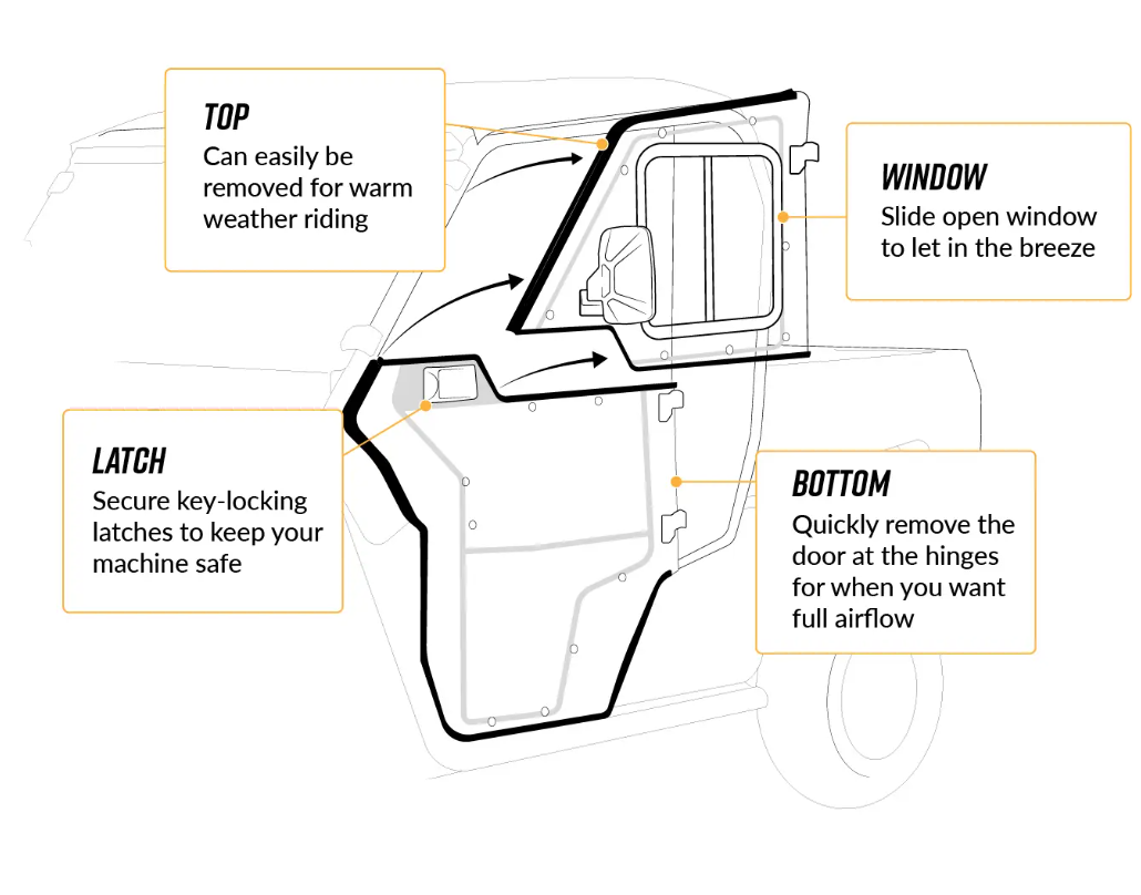 SuperATV’s Convertible Hard Cab Doors for the Polaris Ranger XP 1000 are engineered for year-round versatility. Featuring an innovative two-piece polycarbonate design, these doors convert effortlessly into half doors and include a built-in sliding window for adjustable airflow, ensuring every ride is comfortable regardless of the season.