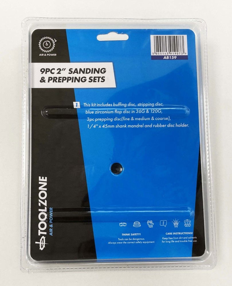 KDP-AB159This nine-piece 2" sanding and prepping set is designed for surface preparation using an electric drill. The set includes a variety of discs and a rubber disc holder, accommodating a range of sanding and buffing requirements. It operates with a maximum speed of 30,000 rpm.