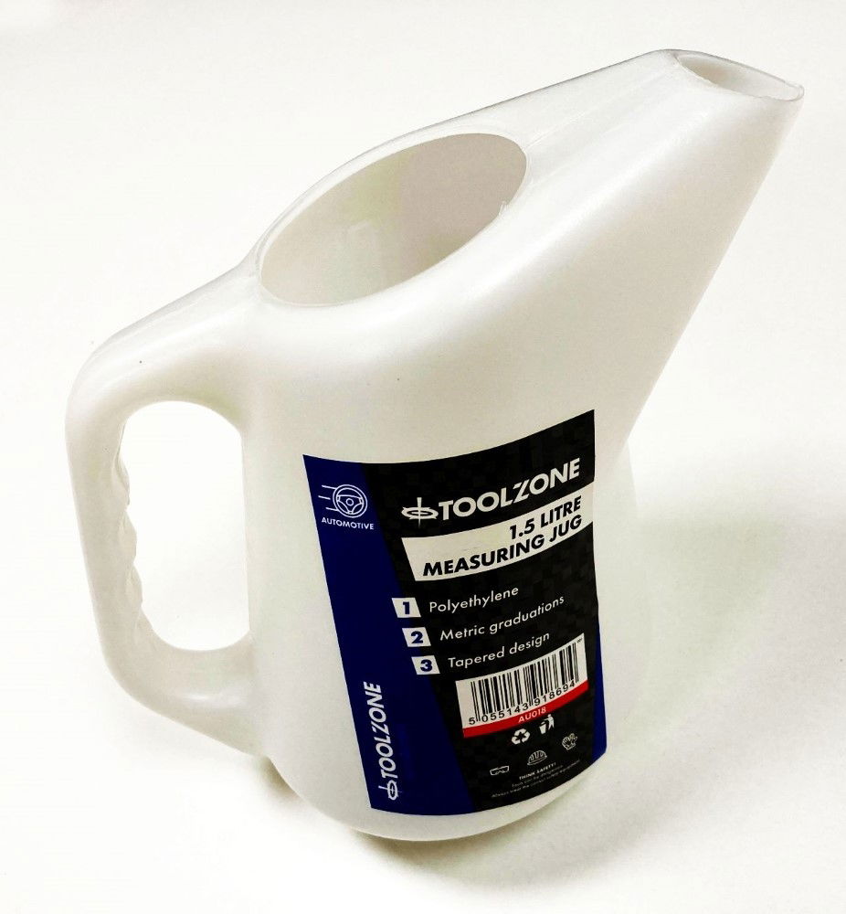 KDP-AU018This 1.5 litre measuring jug features a tapered design with a fixed pouring spout for controlled dispensing. It is manufactured from tough polyethylene and marked with metric graduations, making it suitable for use with oil, paraffin, water, screen wash, and similar fluids.
