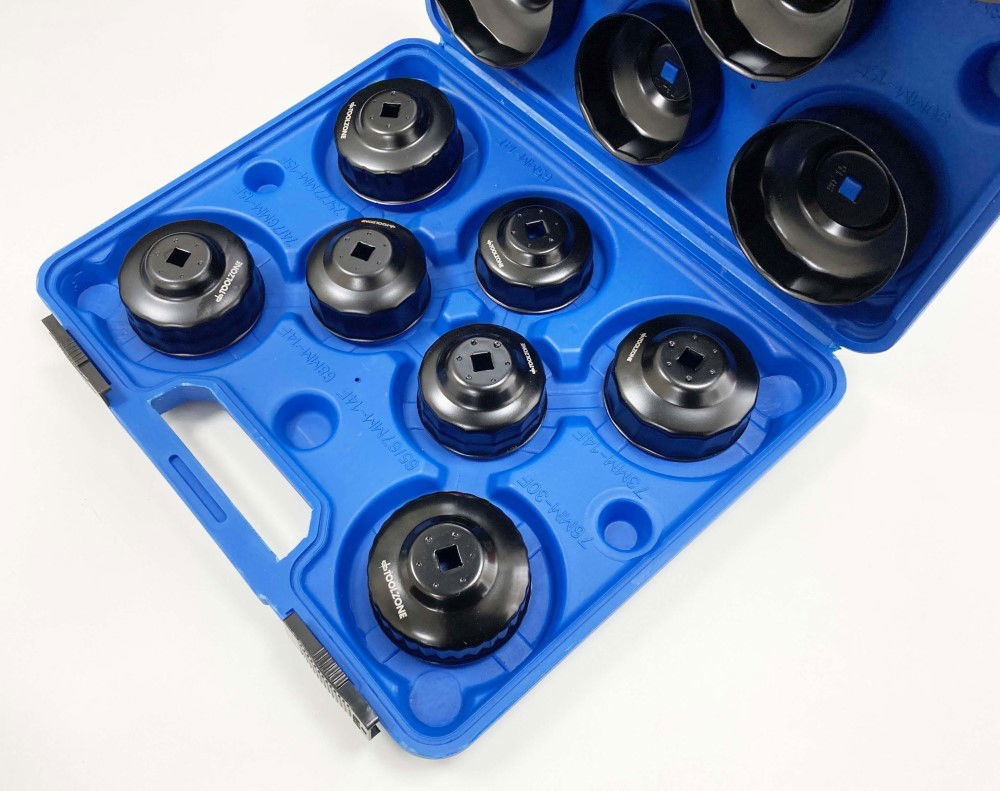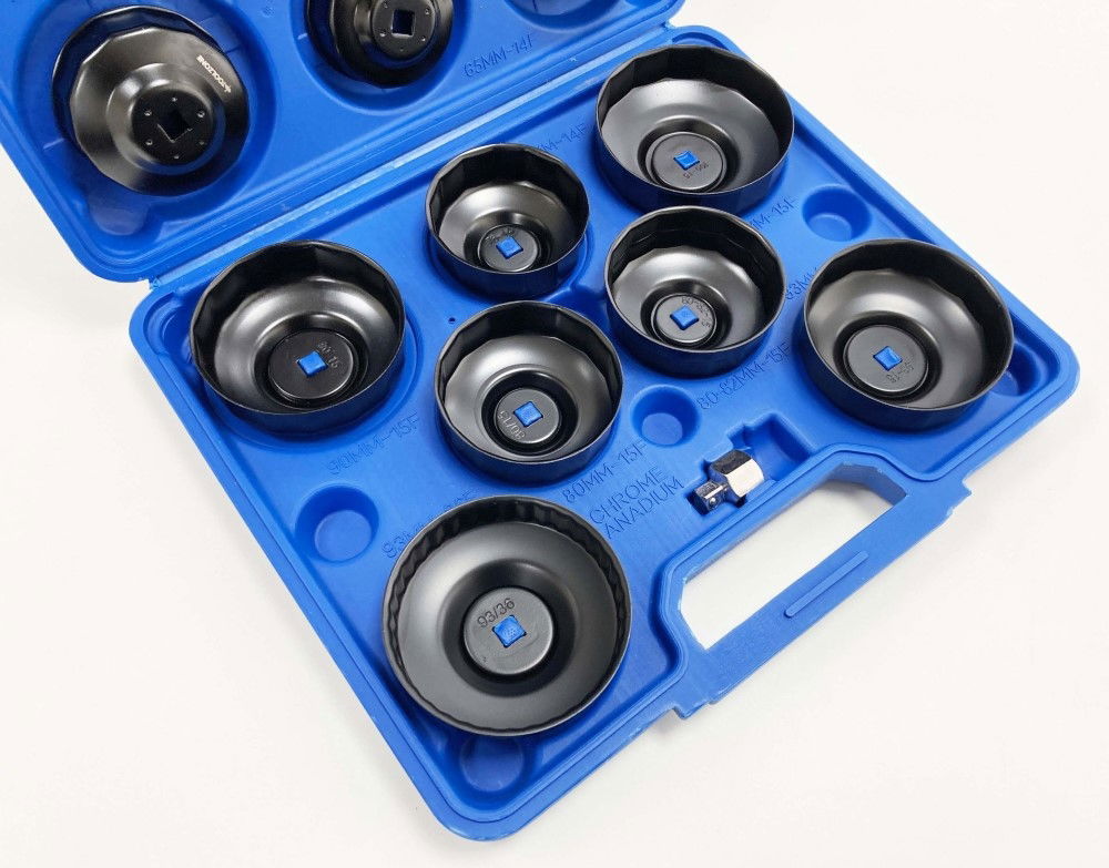 - 16-piece set, including 14 cup-type oil filter wrenches (65–100 mm)