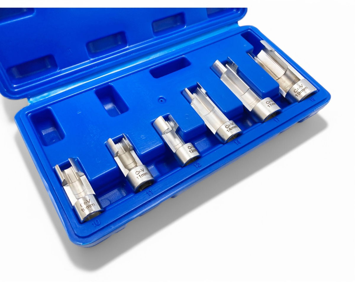 KDP-AU385This 6-piece difficult access socket set is designed for automotive applications involving top and side wired temperature sensors, thermo switches, and similar components. The set includes chrome vanadium slotted sockets in both 3/8” and 1/2” drive sizes.