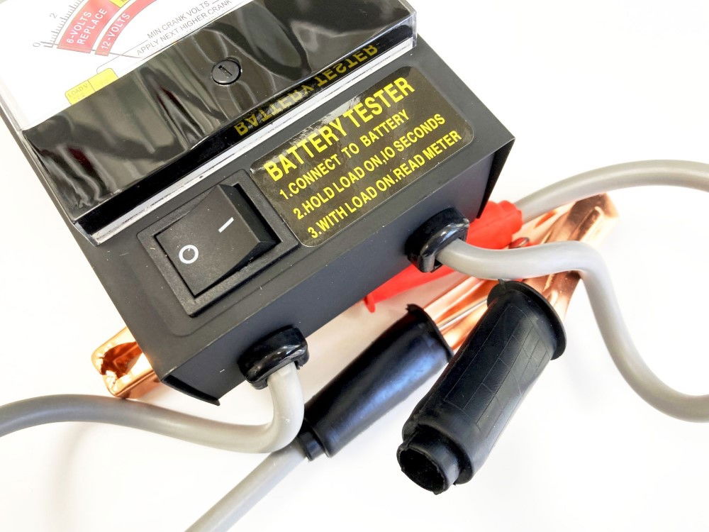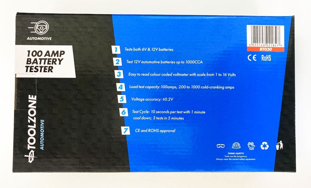 KDP-BT030This 6/12V 100A battery tester is designed for testing both 6V and 12V batteries, including 12V automotive batteries up to 1000 CCA. It features an easy-to-read colour-coded analogue voltmeter with a scale from 1 to 16V and a load test capacity of 100 amps. The unit is CE and ROHS approved.