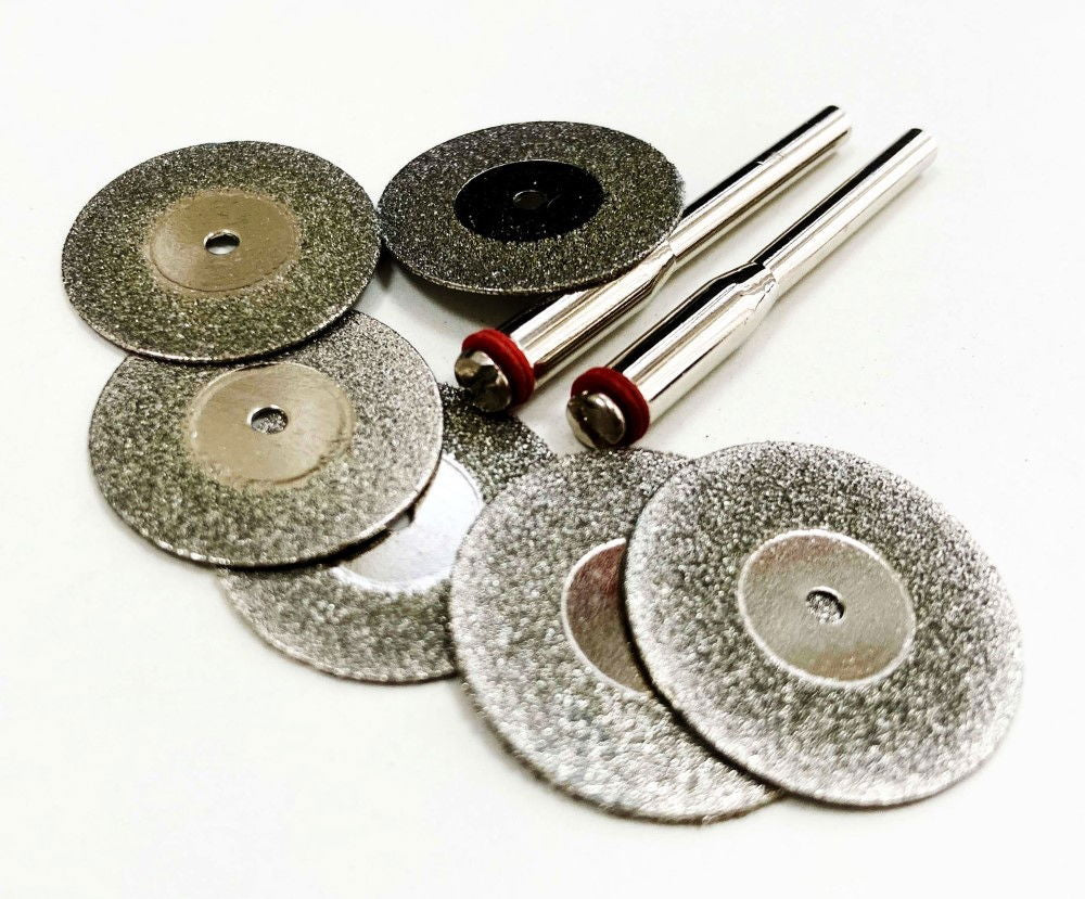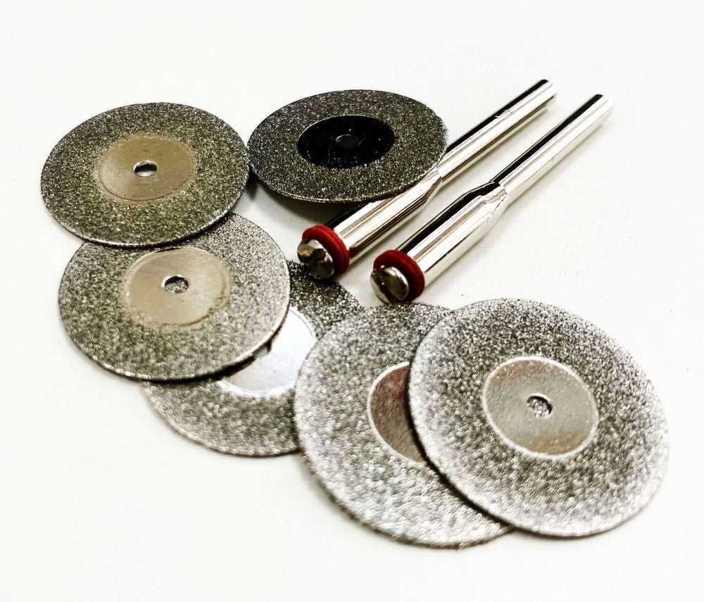 KDP-HB263This 6-piece mini diamond cutting disc set is equipped with a 1/8 inch (3.2 mm) shank and contains four 20 mm and two 22 mm diameter diamond-coated discs. It is suitable for precision cutting tasks on materials such as glass, metal, and stone, with each disc having a thickness of 0.65 mm.