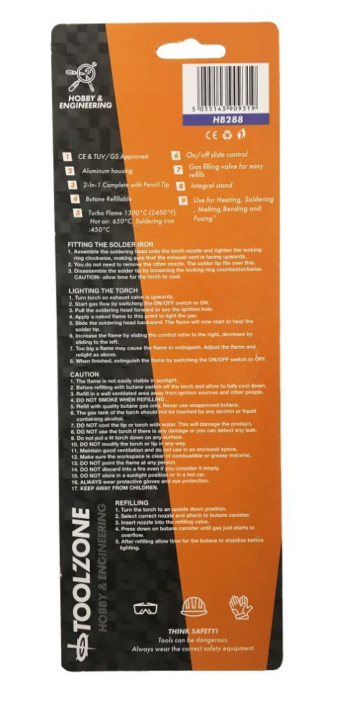 KDP-HB288This 2-in-1 butane solder pencil torch is gas powered, offering both turbo flame and hot air functionalities. It reaches a turbo flame temperature of 1300°C (2450°F) and hot air/soldering iron temperatures up to 450°C, making it suitable for heating, soldering, melting, bending, and fusing applications. The tool includes safety tips and instructions, and is CE and TUV/GS approved.