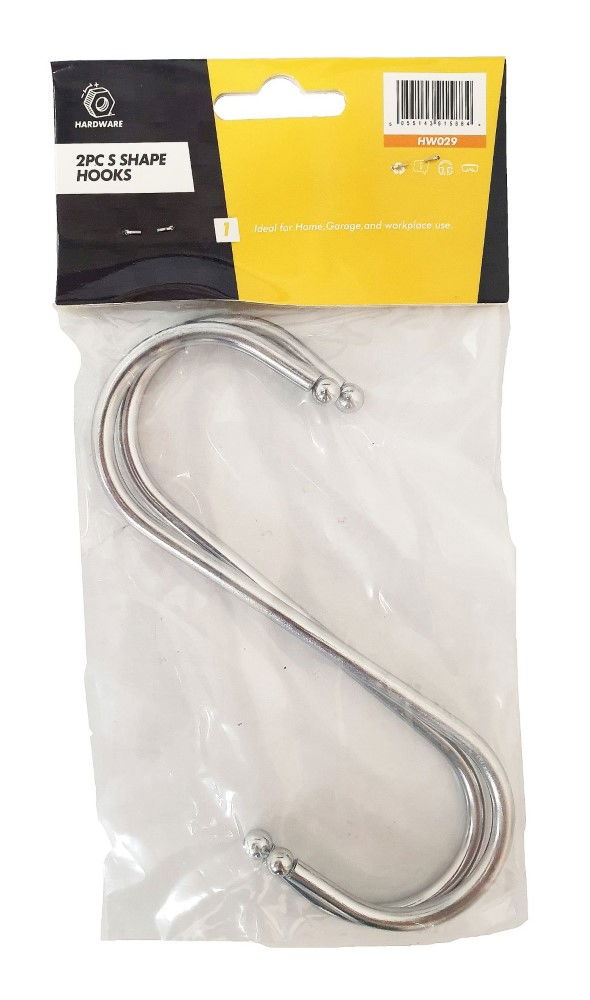 KDP-HW029This set contains two large S hooks made from chrome plated steel, each designed with ball ends to support secure attachment. The size and construction are suitable for various hanging applications.