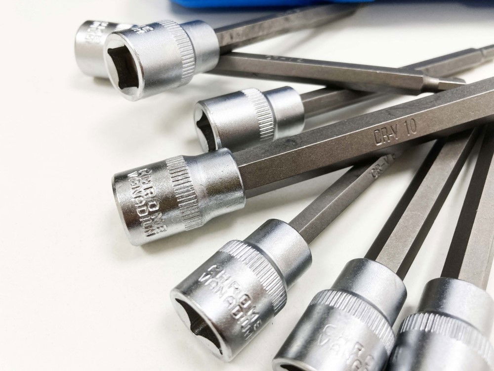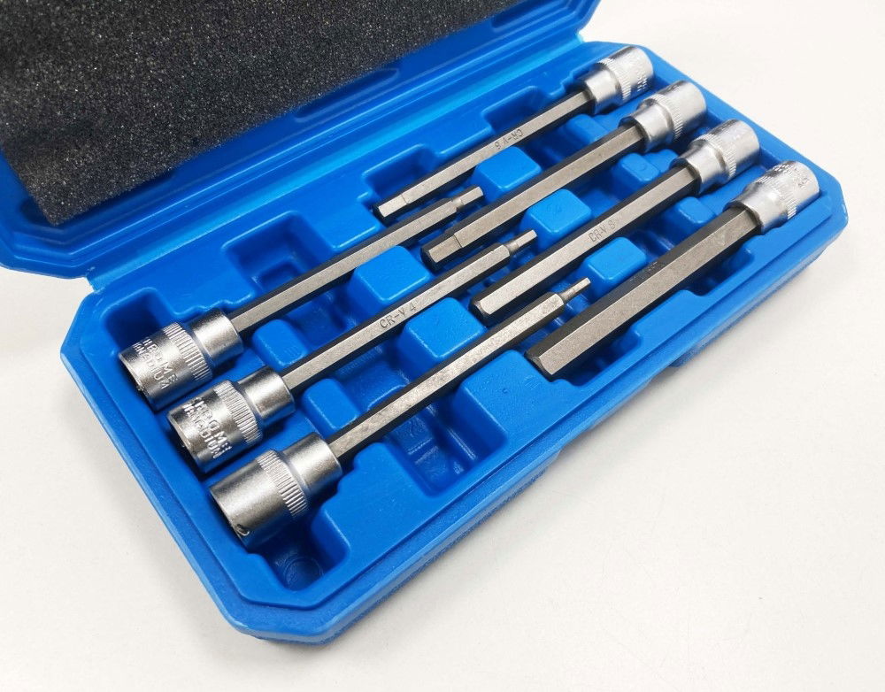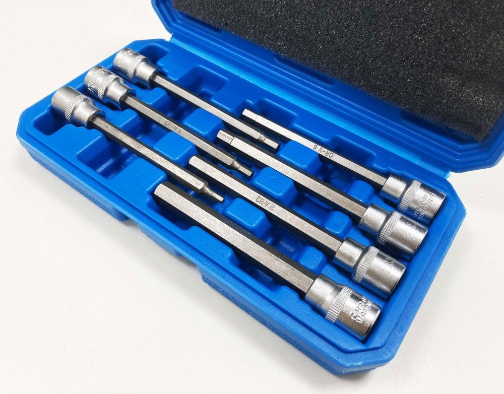 KDP-HX014This 7-piece set of long hex bits features 3/8" drive chrome vanadium steel construction and includes sizes from H3 to H10. Each bit measures 110 mm in length and the set is housed in a tough blow mold storage case.