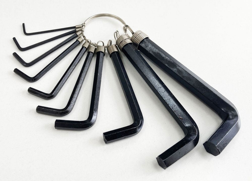 KDP-HX018This 10-piece metric hex key set includes sizes from 1.5 mm to 10 mm and is supplied on a convenient ring. Each key is made from heat treated carbon steel with a black finish.