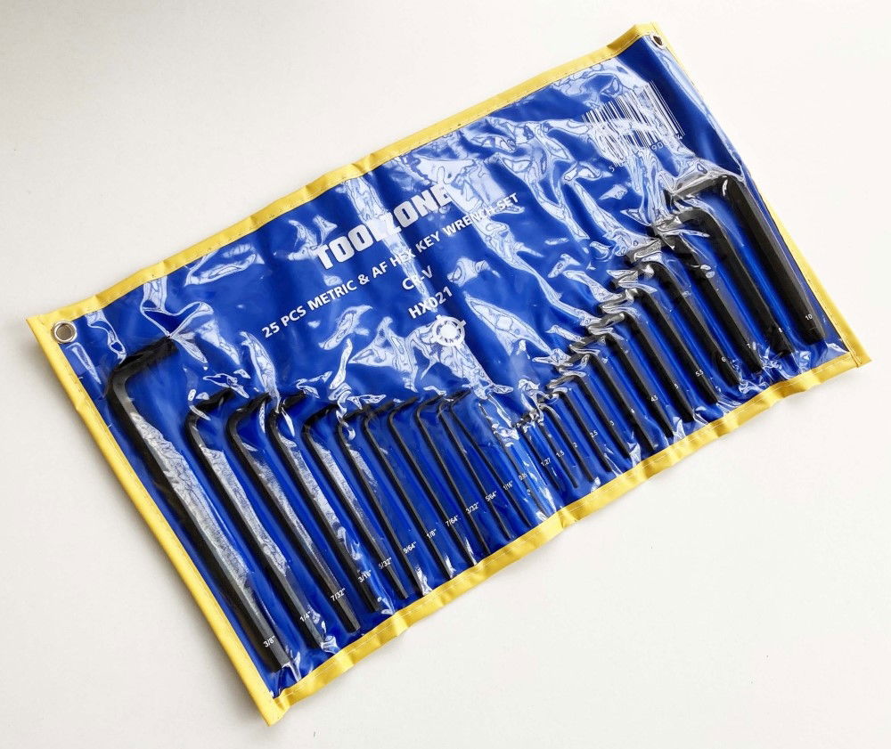 KDP-HX021This 25-piece set includes both metric and AF hex keys made from heat treated chrome vanadium steel with a black finish. The hex keys are supplied in a vinyl wallet with two mounting holes for organized storage.