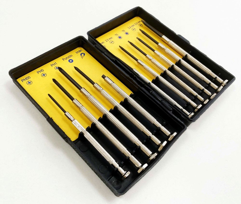 KDP-SD211This 11-piece precision screwdriver set includes Phillips and slotted screwdrivers, an awl, and an alarm resetter, all housed in a plastic storage case. The set is designed for detailed and delicate tasks.