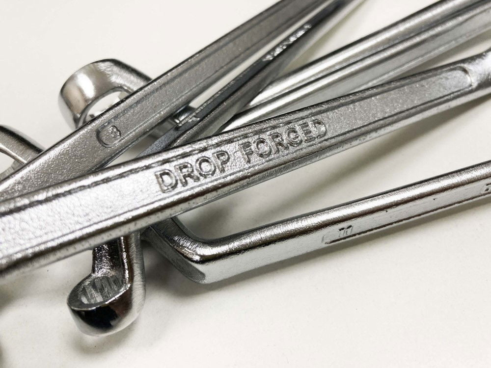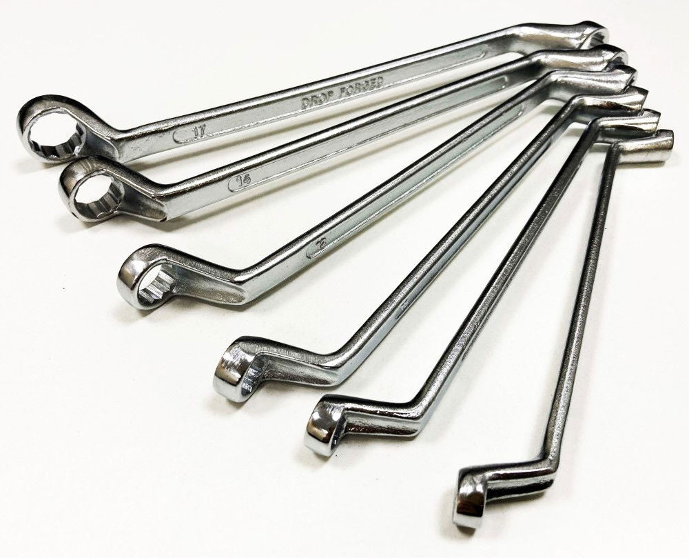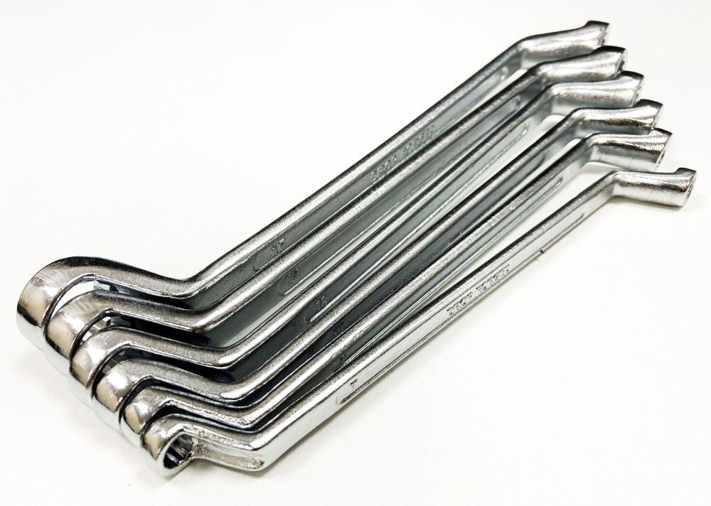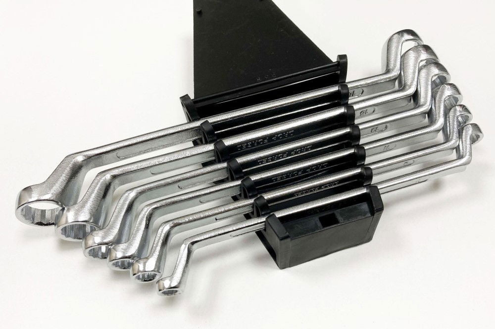 KDP-SP023This 6-piece ring spanner set includes double-ended sizes ranging from 6x7 mm to 16x17 mm. Each spanner is made from drop forged, chrome plated steel and comes with a hanging rack for storage.