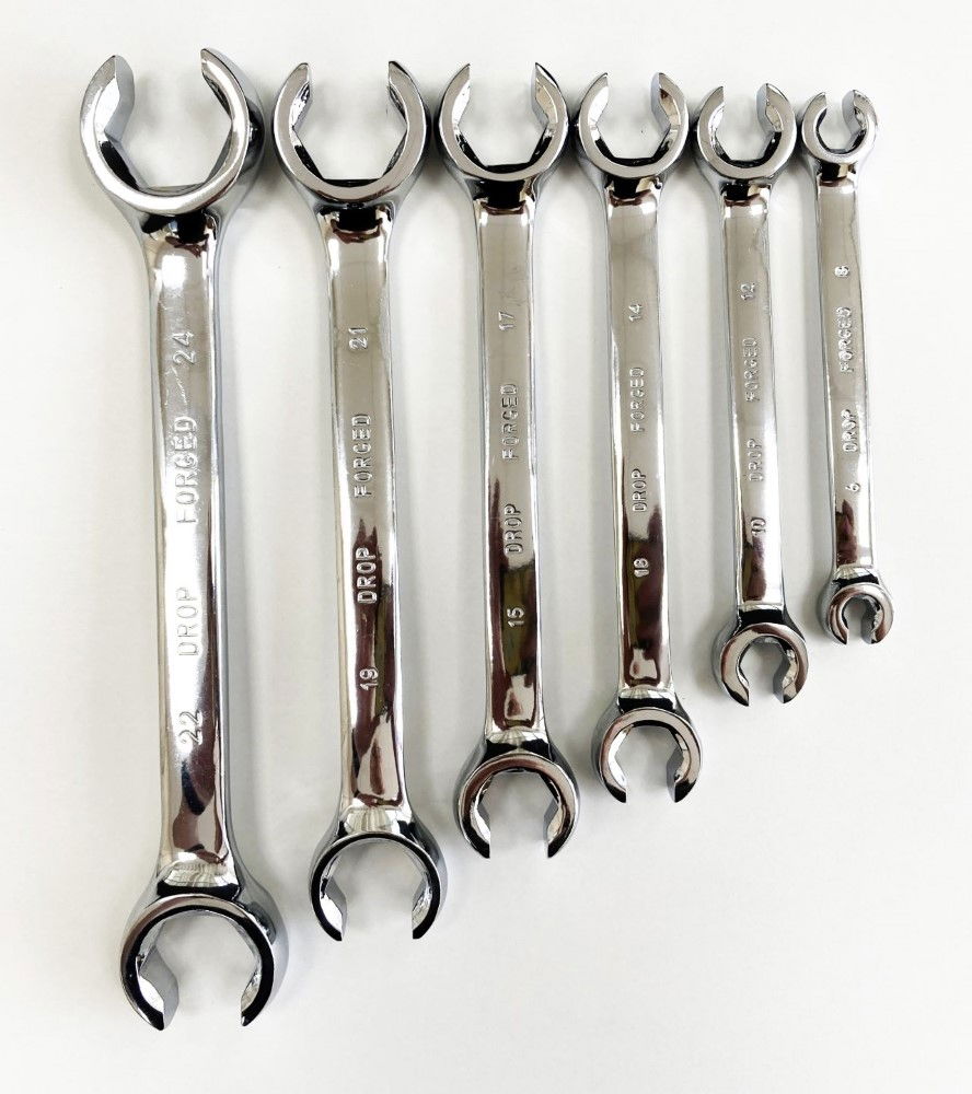 KDP-SP034This 6-piece heavy-duty flare nut wrench spanner set includes double-ended sizes ranging from 6x8 mm to 22x24 mm. Manufactured from chrome vanadium steel with a fully polished finish, the set is suitable for various fastening applications.