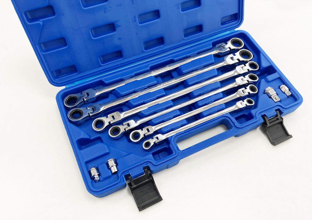 KDP-SP198This 10-piece flexi ratchet spanner set includes paired metric sizes ranging from 8 x 9 mm to 17 x 19 mm and comes with multiple adaptors and a screwdriver bit adaptor. Each spanner is made from drop forged chrome vanadium steel with a mirror polish finish and features a 72 teeth mechanism. The set is supplied in a storage case.