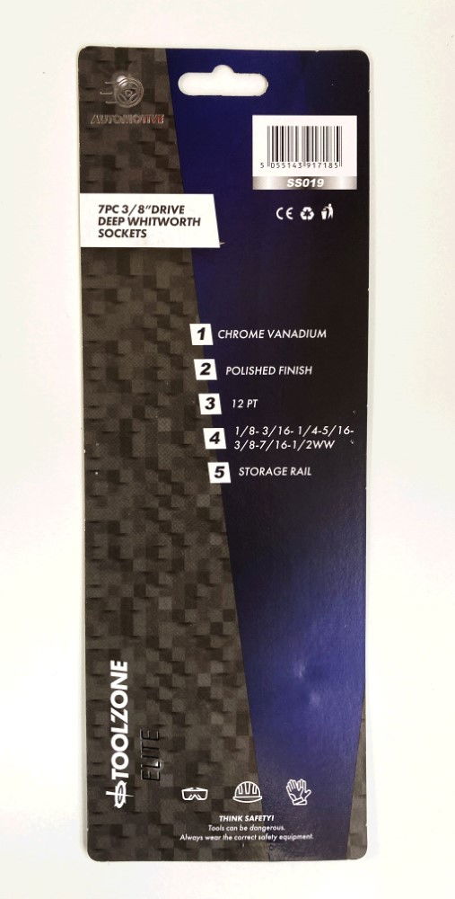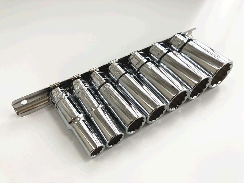 KDP-SS019This 7-piece set of 3/8" deep Whitworth sockets is made from chrome vanadium steel with a polished finish. The set includes sizes 1/8, 3/16, 1/4, 5/16, 3/8, 7/16, and 1/2 WW. The sockets are supplied on a mountable storage rail, with package dimensions of 11 x 31 x 4 cm.