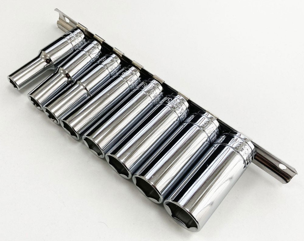 KDP-SS303This 8-piece set of 3/8" drive deep AF sockets is made from chrome vanadium and features a polished finish. Socket sizes range from 5/16" to 3/4". The set is supplied with a mountable storage rail and packaged in dimensions of 11 x 32 x 4 cm.