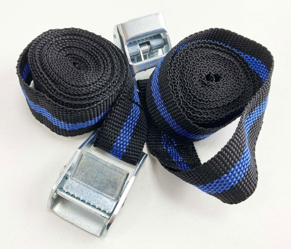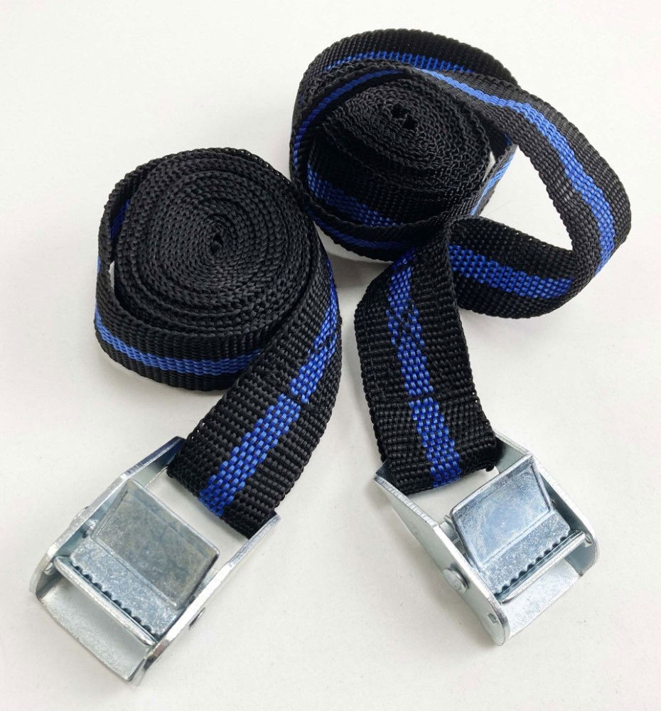 KDP-TD028This tie down set includes two buckle-type straps, each measuring 2.5 meters. The working capacity is between 180 and 200 kg, with a breaking strain of 250 kg. The straps feature a push button for quick release and are suitable for use with small trailers, hand trucks, or luggage. Package dimensions are 15 x 15 x 4 cm.
