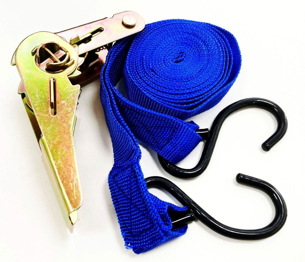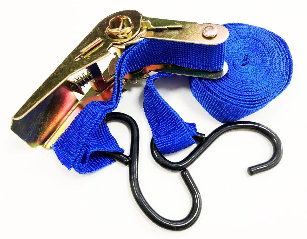 KDP-TD031This ratchet tie down strap measures 25 mm in width and 4.5 m in length. It features double vinyl-coated steel “S” hooks to ensure a secure hold without causing scratches. The strap has a breaking strength of 100 kg and is equipped with a push button for quick release. Package dimensions are 14 x 21 x 5 cm.