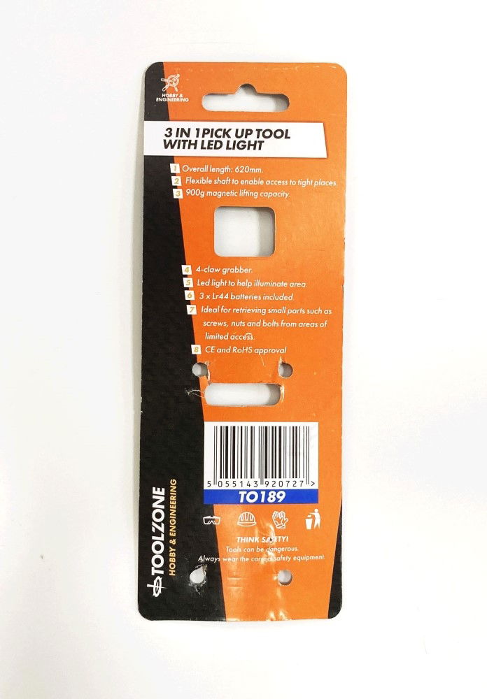 KDP-TO189This 3-in-1 tool combines a flexible magnetic pick-up, a four-claw grabber, and an LED light to assist with retrieving small items in difficult-to-access areas. The device measures 620 mm in length and is capable of lifting up to 900 grams magnetically. It comes with three LR44 batteries included and meets CE and ROHS standards. Full product dimensions are 7 x 67 x 3 cm.