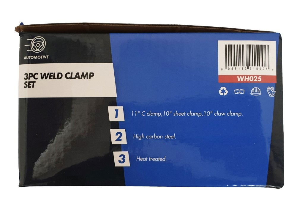 KDP-WH025This 3 piece weld clamp set includes an 11" C clamp, a 10" sheet clamp, and a 10" claw clamp. All clamps are heavy duty and made from drop forged steel, featuring adjustable quick action clamp and release mechanisms.