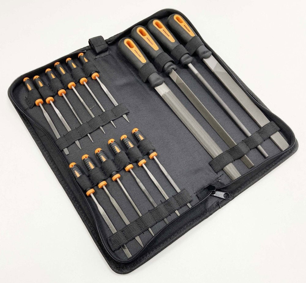 KDP-WW216This 16-piece file set is supplied in a canvas carrying case and includes a selection of 200 mm second cut files and 100 mm bearing steel files in various profiles. Each file is equipped with a soft grip handle for ease of use.
