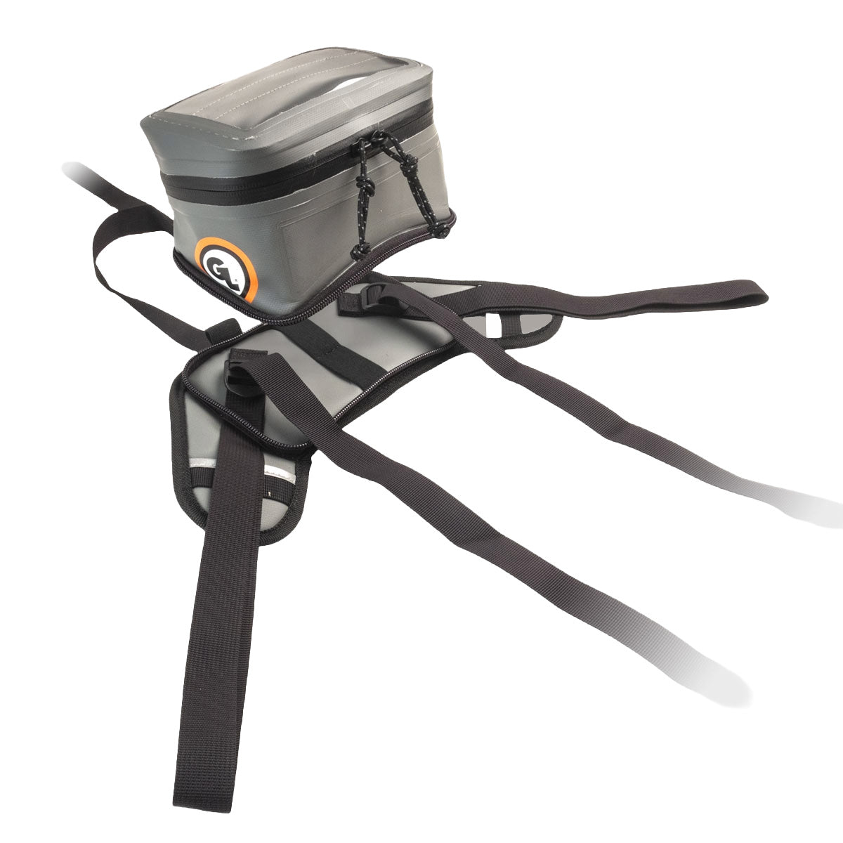 BNR20-GThe Buckin’ Roll Tank Bag in Grey by Giant Loop is a slim, minimalist tank bag designed to carry essential items securely and stay out of the rider’s way, even during technical off-road riding. It offers approximately 1.5 litres of waterproof storage and mounts behind the fuel filler cap using a stable three-point harness system.