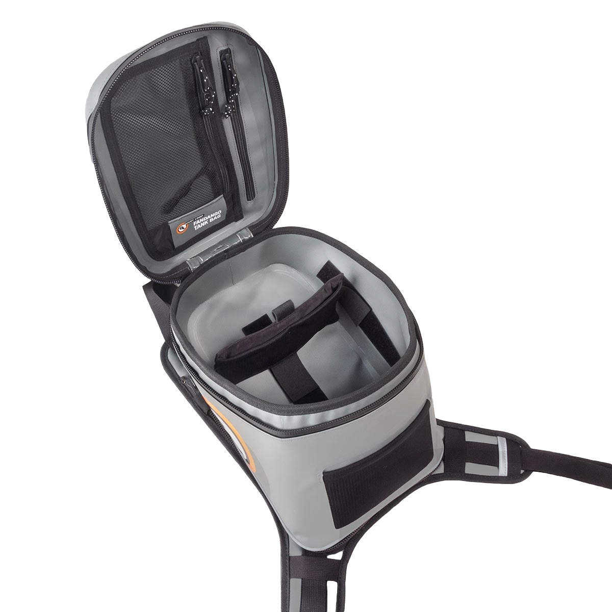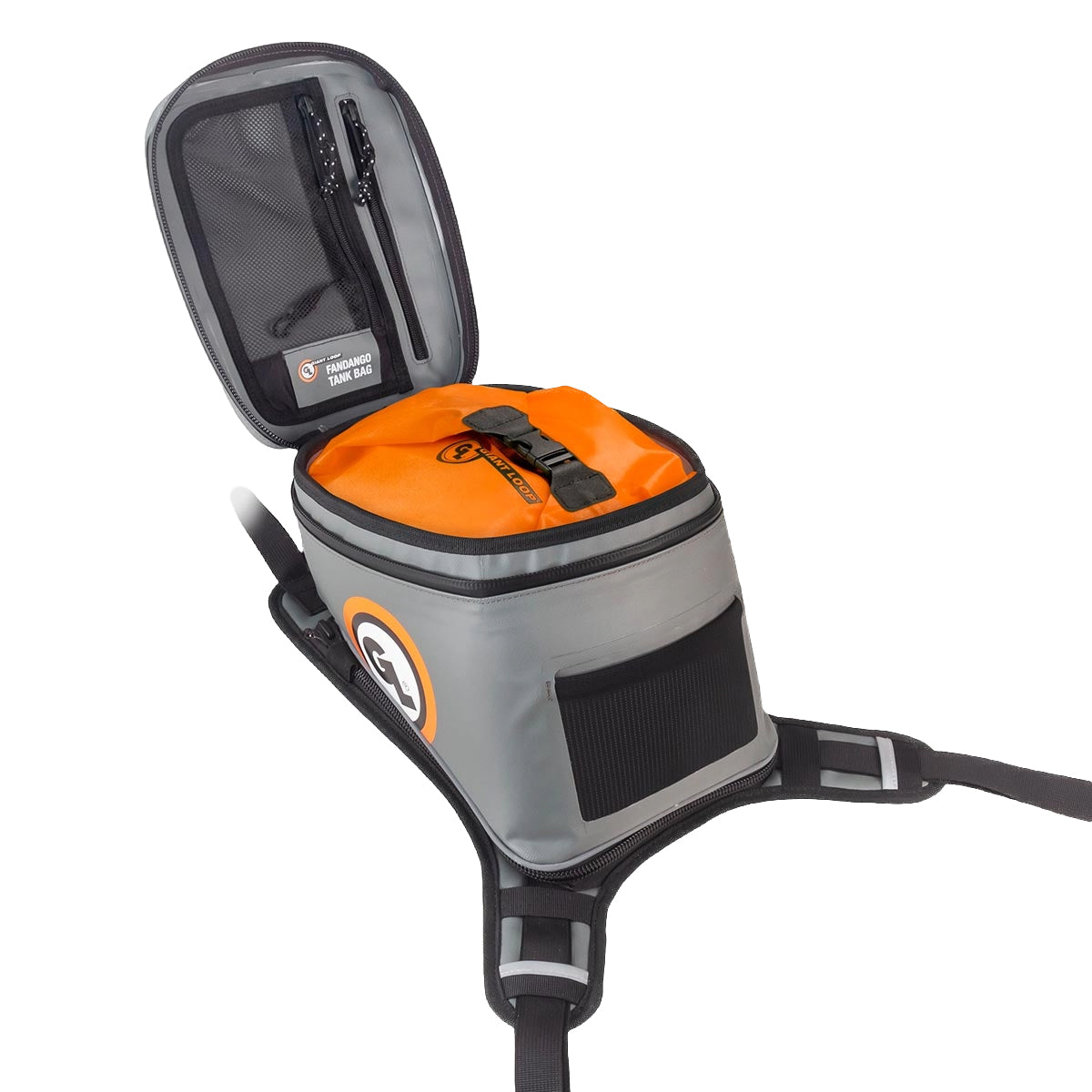 FTB21-GThe Fandango Tank Bag in grey is a robust, rider-focused tank bag offering 8 litres (490 cu in) of packable volume. It is engineered to mount close to the motorcycle with a slim profile that stays clear of rider body position, whether seated or standing, and allows quick access to the fuel cap without full removal. It includes a waterproof internal liner, organisational elements tailored for adventure riding, and is backed by Giant Loop’s limited-lifetime warranty.