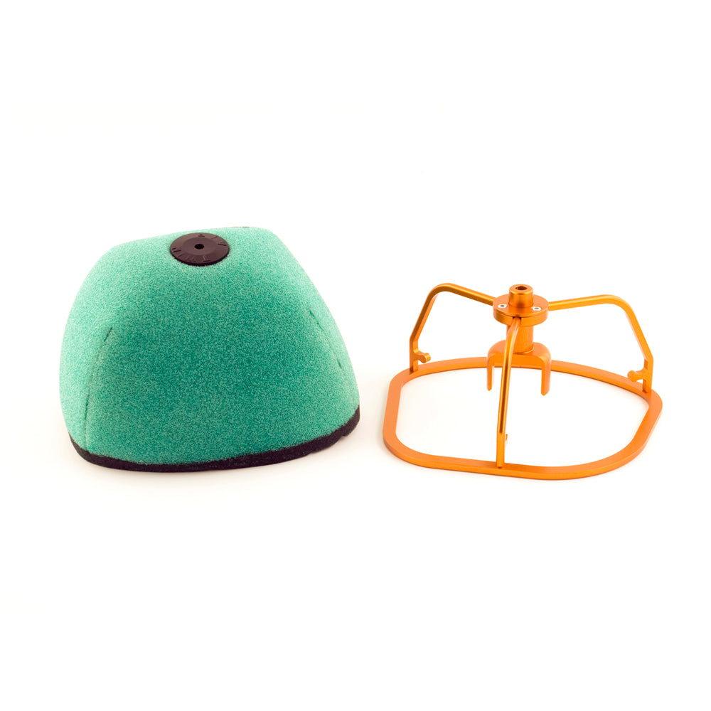 The best filter in the world can't do its job if there are leaks in the seal of the airbox. That's why Twin Air provides a complete line of products to ensure a leak-proof, fool-proof fit. Twin Air's Power Flow kit comes with a rigid, lightweight, billet aluminium cage that provides a tight seal to the airbox and replaces your flimsy plastic stock cage. Includes a Fire-resistant Twin Air Filter.