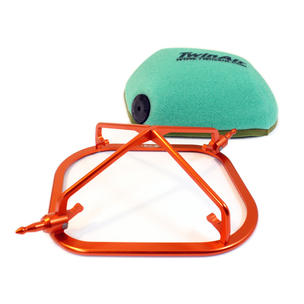 The best filter in the world can't do its job if there are leaks in the seal of the airbox. That's why Twin Air provides a complete line of products to ensure a leak-proof, fool-proof fit. Twin Air's Power Flow kit comes with a rigid, lightweight, billet aluminium cage that provides a tight seal to the airbox and replaces your flimsy plastic stock cage. Includes a Fire-resistant Twin Air Filter.