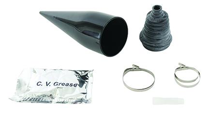 -Kit includes one universal boot, one reusable cone tool, two stainless steel clamps, grease pack, and silicone cone lube and instructions.
