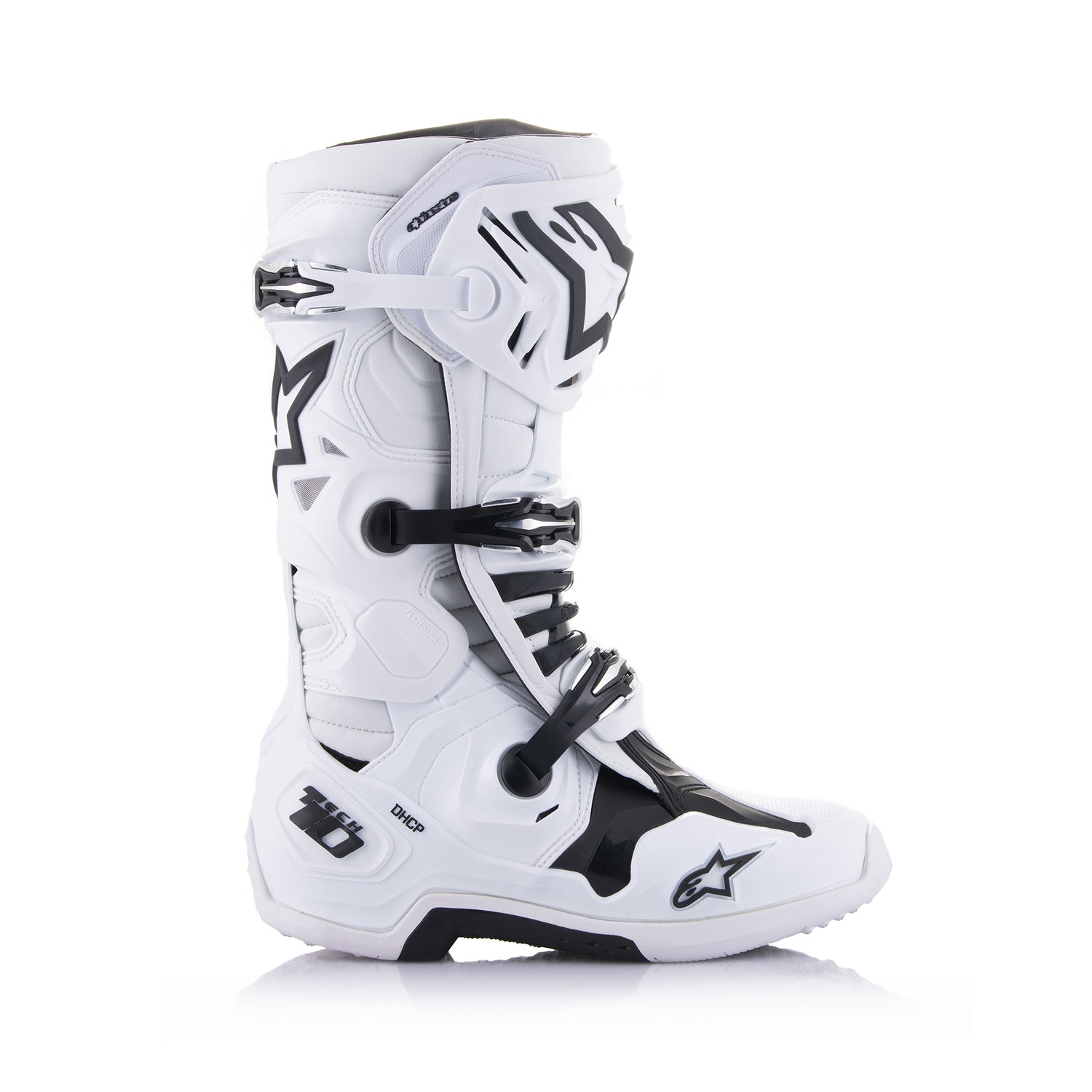 - Built into the Tech 10s unique and lightweight single-piece co-injected foot chassis is the patented Dynamic Heel Compression Protector (DHCP), an innovative safety feature that includes a fully integrated collapsible heel area with expanded poly-foam to absorb high impact energies during a crash. DCHP features a directional impact protection system that significantly reduces the effect of excessive, potentially injury-causing, energy being transferred to the ankle and lower leg. DHCP has been used by Alpinestars athletes in the demanding environments of professional Supercross and Motocross.