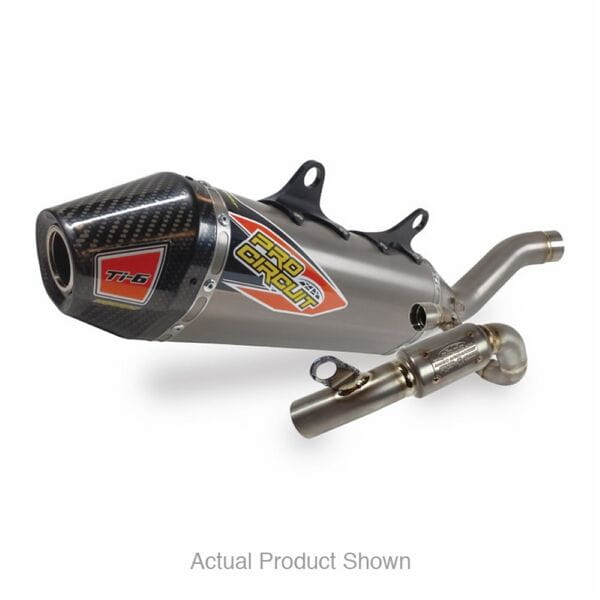 UPC0352225FThe Ti-6 Titanium Exhaust System is designed to improve performance and is constructed of titanium throughout the head pipe, mid pipe, and canister while the end-cap is constructed of carbon fiber. The Ti-6 is ideal for any closed-course or off-road racer looking for improved performance, durability and a professional look. Although the Ti-6 will not pass FIM sound requirements seen in professional racing here in the states or in Europe, the Ti-6 will meet AMA amateur noise requirements, and comes equipped with a removable USFS approved spark arrestor making it easy for riders to alternate between off-road and closed-course racing.Features:Offering maximum performance while meeting AMA amateur noise requirementsIdeal for closed-course or off-road racingTitanium construction throughout head pipe, mid pipe and canisterCarbon fiber end-cap constructionEquipped with RC-4 Resonance Chamber to reduce noise outputMachined aluminum muffler bracket for increased strength and durabilityAsymmetrical muffler configuration for increased packing volumeMachined mid pipe to head pipe joint for a better, leak free fitRemovable USFS approved spark arrestorTIG precision weldingMade in the USAFitment:KTM 250 SX-F 23-24Husqvarna FC 250 23-24KTM 350 SX-F 23-24Husqvarna FC 350 23-24KTM 350 EXC 24Husqvarna FE 350 24KTM 250 EXC 24Husqvarna FE 250 24Gas Gas MC 250 24Gas Gas MC 350 24Gas Gas EC 250 24 Gas Gas EC 350 24ColourSilver