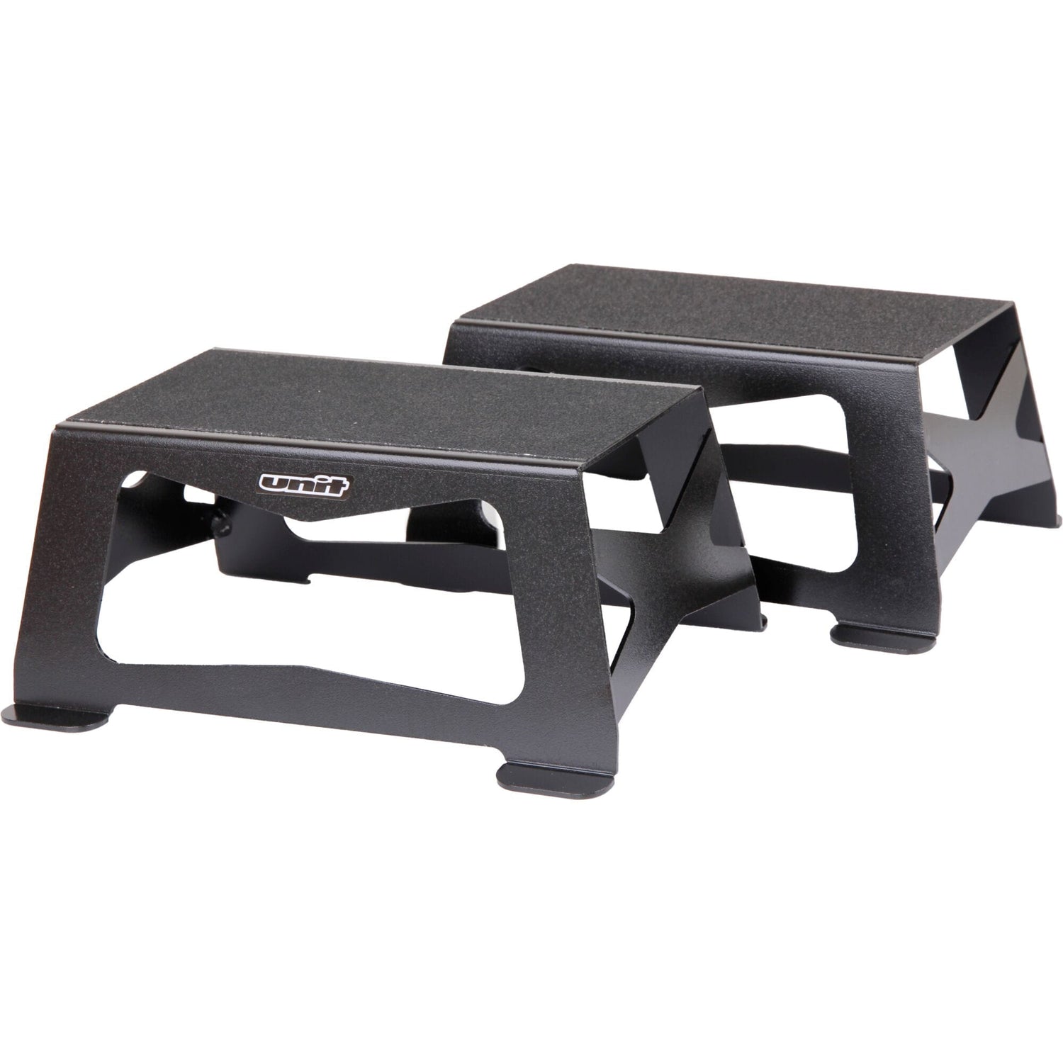 Manufactured using a strong yet durable steel material and finished with a black powder-coated finish to help against damage and corrosion. A lightweight but stackable design makes them easy to carry and store away in your garage or vehicle. Non-slip top surface for better grip under the rider's boots and x4 wide, none slip feet for maximum grip on the start gate floor.